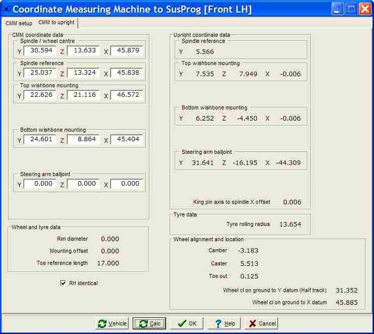The upright dimensions are all calculated relative to a vertical king pin axis (in side view). In this example, because the longitudinal axis is positive rearwards, the positive value indicates that the spindle is behind the strut rod axis 0.006", hence the strut rod X data points are negative (ie in front of the spindle by 0.006").If "identical" is ticked, then the specified CMM coordinates will be calculated for the opposite side of the vehicle as well.