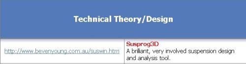 Posted by Anonymous on 01-01-2004 12:00 AM I use SusProg3D. You can download a free demo copy from http://www.bevenyoung.com.au/ The demo will allow you to move around some pick up points, but others are fixed. The SusProg3D help files contain GREAT amounts of technical information