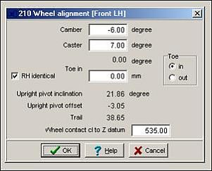 of the lower wishbone), chassis roll and wheel travel increments and roll