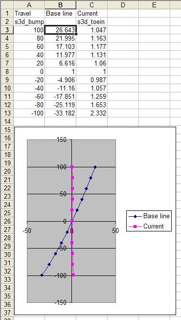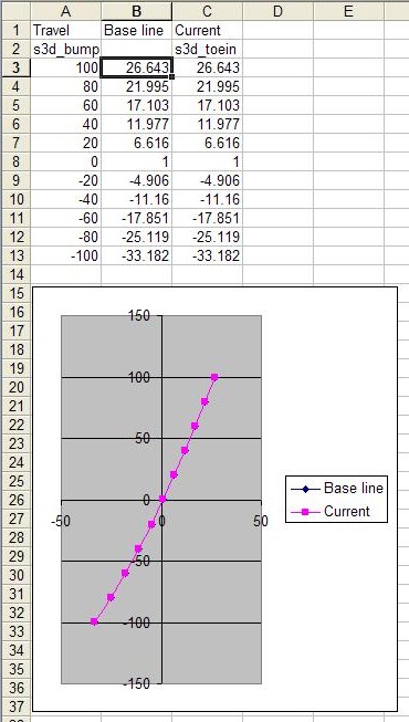 Our objective is to achieve a zero bump steer, by moving the rack location a small amount at a time, and, by graphing both the "base line" and "current" bump steer curves, be able to graphically communicate the resulting improvement.
